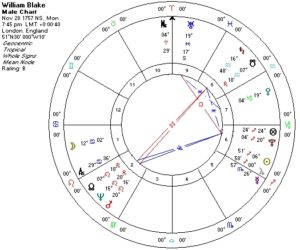 Arriving at the astrology of William Blake’s returns me to a chart I used to illustrate some ancient astrological techniques ten years ago in Astrological Roots: The Hellenistic Legacy. The astrology of his chart and his life, like his art and poetry, has often returned to me over the years.