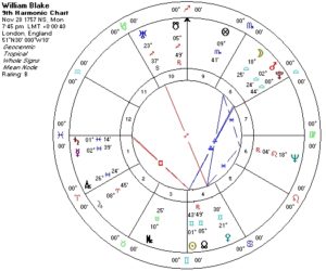 In this context and leaving traditional astrology behind, let’s feast on Blake’s Ninth Harmonic chart. A harmonic chart tunes the positions in a natal chart to a certain number. The Ninth Harmonic chart, repeating the zodiac every forty degrees (360 divided by 9) displays divisions of the number of personal and spiritual fulfillment (three times three, the trine being the nature of pleasure or worldly happiness). Often the effects of a prominent Ninth Harmonic chart can be seen in the areas of spiritual insight and creativity, with or without artistic expression. It seems that Blake’s large-scale prophetic works display much of what we find in this chart.
