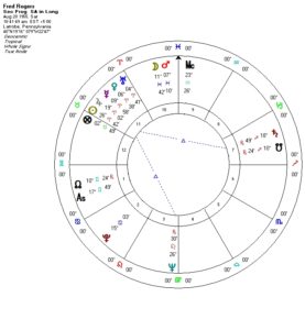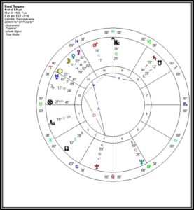 This year we have heard and read much about Fred Rogers, his life and work. For a lifelong Republican and ordained Presbyterian minister the words “subversive” have been applied to Rogers, but so do the words “kindness” and “goodness”. Currently, many wish to consider Rogers’ values that may be in decline. In this essay that explores Rogers in an astrological context, I will add the adjectives “effective” and “significant” to describe him, for Rogers was also successful and culturally impactful in his day and in ours. Adding Fred Rogers to my series on Exemplary Individuals was, in common parlance, a no-brainer.