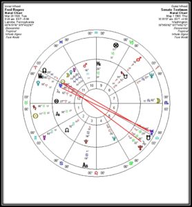 From ancient astrology we see another indication of the importance of his Venus-Mercury conjunction. Noting Fred Rogers’ Lot of Fortune at twenty-seven degrees of Aries (we’ll discuss this position soon), and taking the distance between this Lot and the Ascendant, it’s just under eighteen degrees. We go eighteen degrees the other way from the Ascendant and we find ourselves at three degrees of Gemini, and that becomes the position of his Lot of Spirit or Daemon. This is almost exactly ninety degrees from the Venus-Mercury conjunction so that these planets are angular to the Lot of Spirit or Daemon. This further indicates an independent and forward-thinking mind.