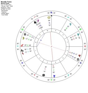 We will end with Venus and my notable omission of any information about Ficino’s personal life.  Venus is in the Eighth Place in its fall in Virgo, and yes there’s no mention of women in this man’s life. Her may have remained celibate throughout his life. His culture was male-dominated and his ancient mentors Plato and the Neoplatonists maintained a distrust of women and their (allegedly) more physical natures.  If you’re familiar with the infelicitous expressions “Platonic relationship” and “Platonic love”, now you know the origin of these concepts.